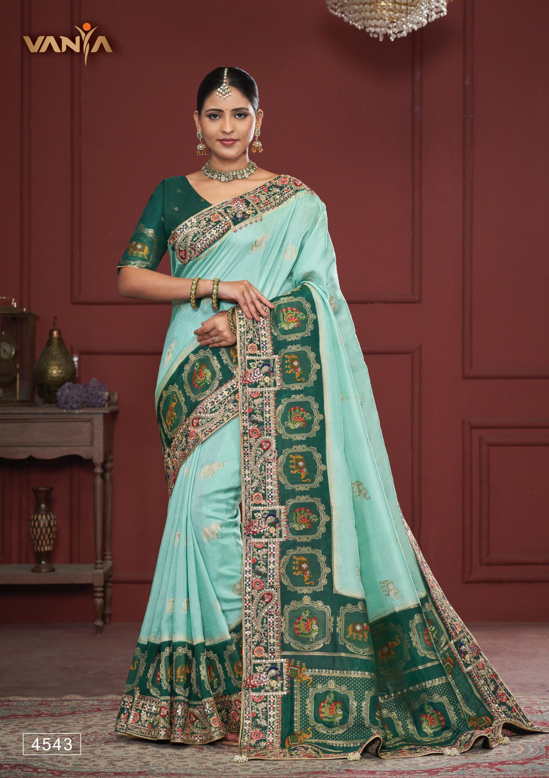 Step into your fairytale moment with this magnificent Vanya bridal saree. The lustrous Dola silk flows in a serene shade of sea green, providing the perfect canvas for the true masterpiece: an opulent, heavily embroidered border depicting a royal wedding procession with elephants and peacocks. This is an heirloom in the making, a masterpiece of craftsmanship designed for the most treasured day of your life.
