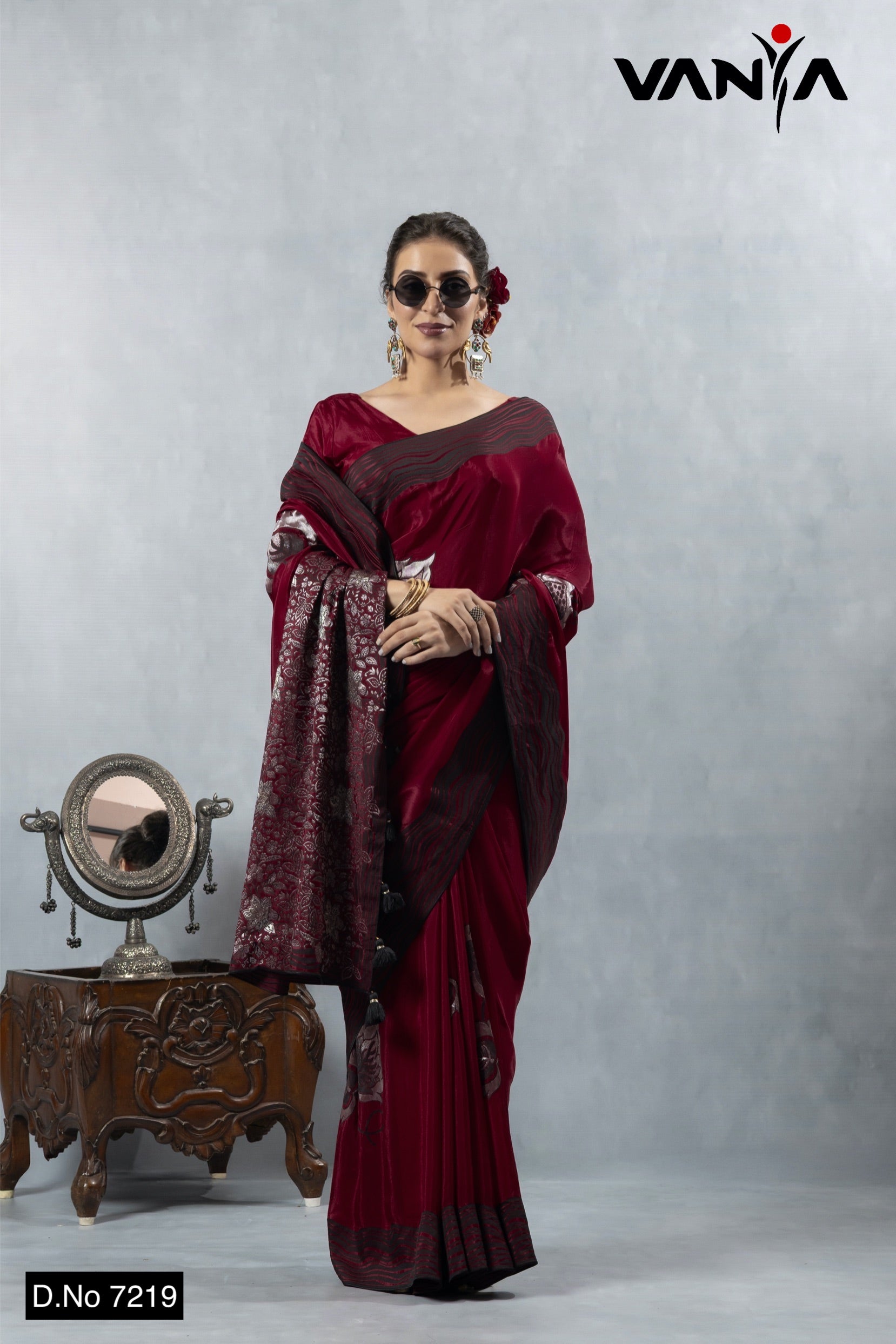 Make a dramatic entrance with the **Vanya Wine & Silver Saree**, a piece designed for the spotlight. This saree drapes like a dream in a rich **Maroon Silk Blend**, setting the perfect canvas for the striking **metallic silver** detailing. It’s the ultimate statement of luxury, blending traditional brocade artistry with a high-fashion, contemporary aesthetic.