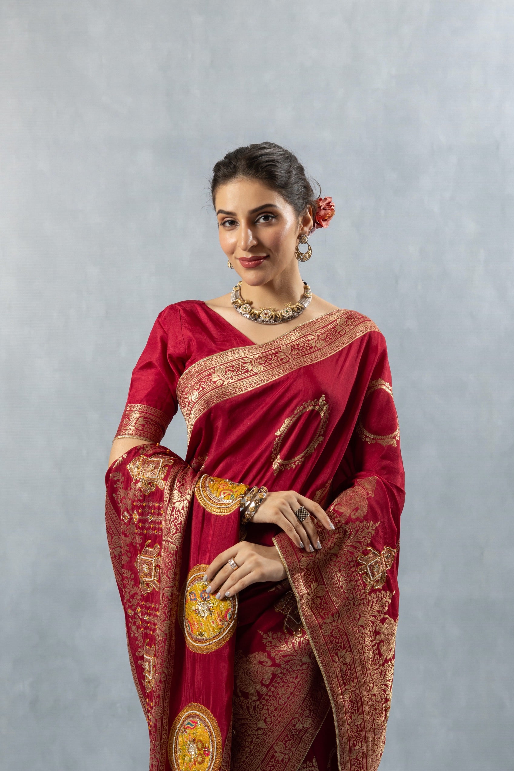 Vanya Maroon Art Silk Saree with Heavy Gold Zari Weave and Folk Motifs
