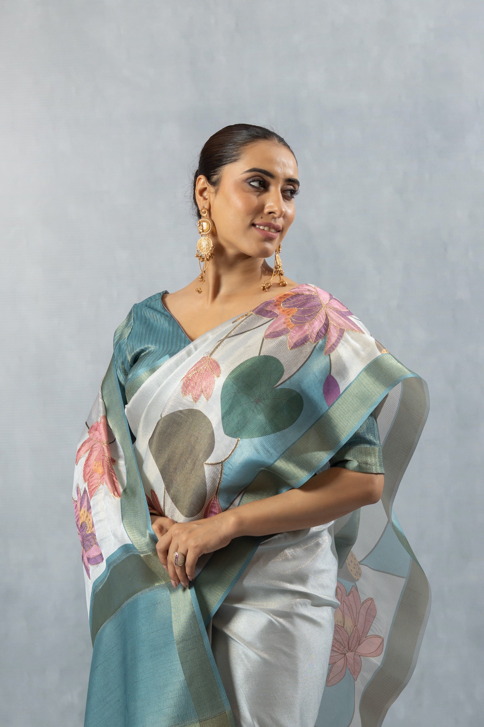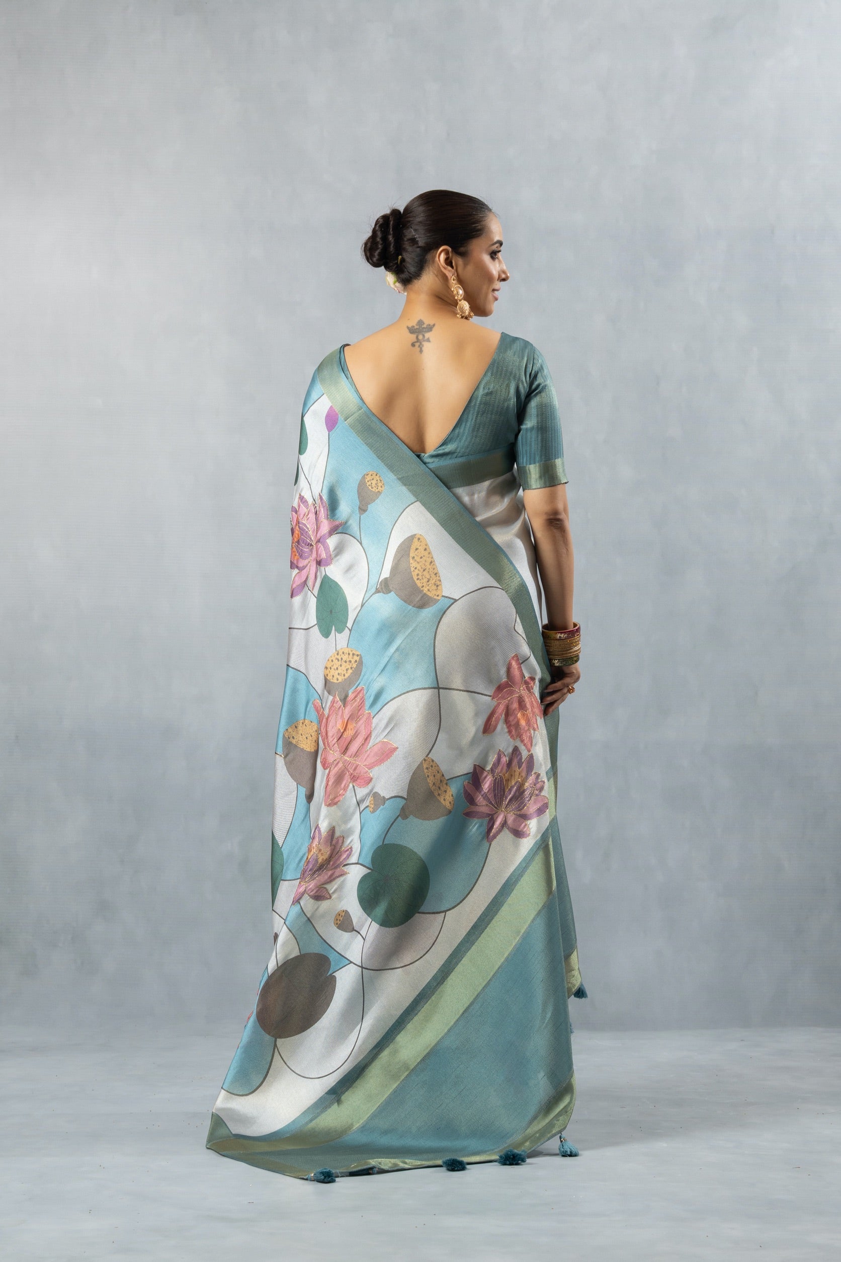 Vanya Lotus Digital Print Linen-Silk Saree with Teal V-Neck Blouse
