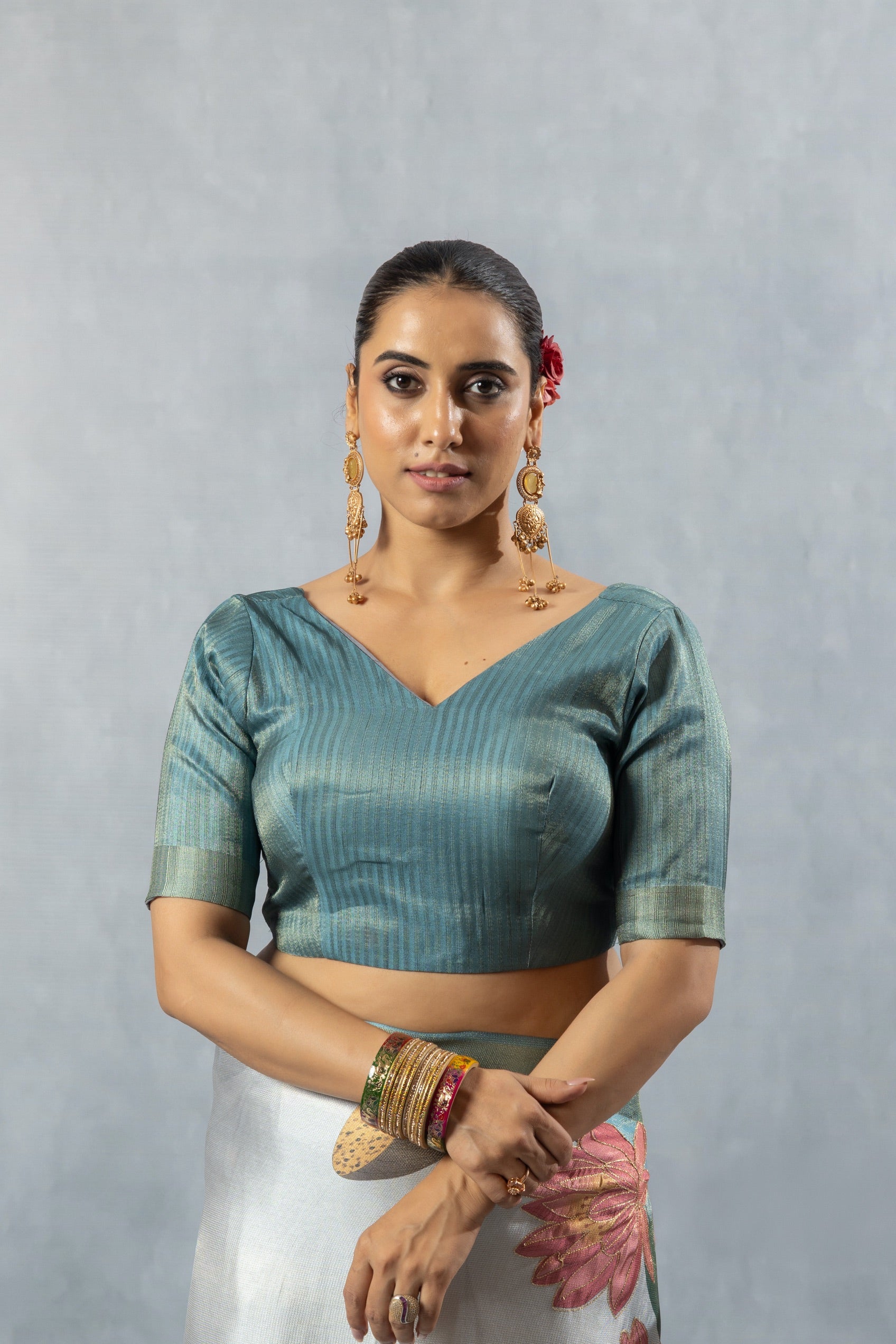 Keep your accessories minimal and impactful. Pair this saree with large, antique gold jhumkas or chandelier earrings and simple stacked bangles to let the vibrant print take centre stage.