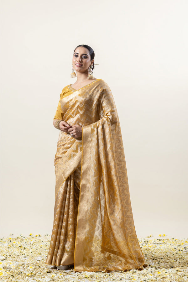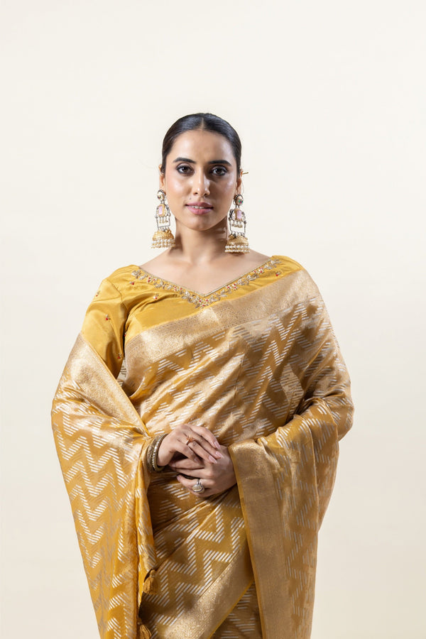 Mustard Gold Banarasi Silk Saree with Woven Chevron Pattern and Embroidered Blouse
