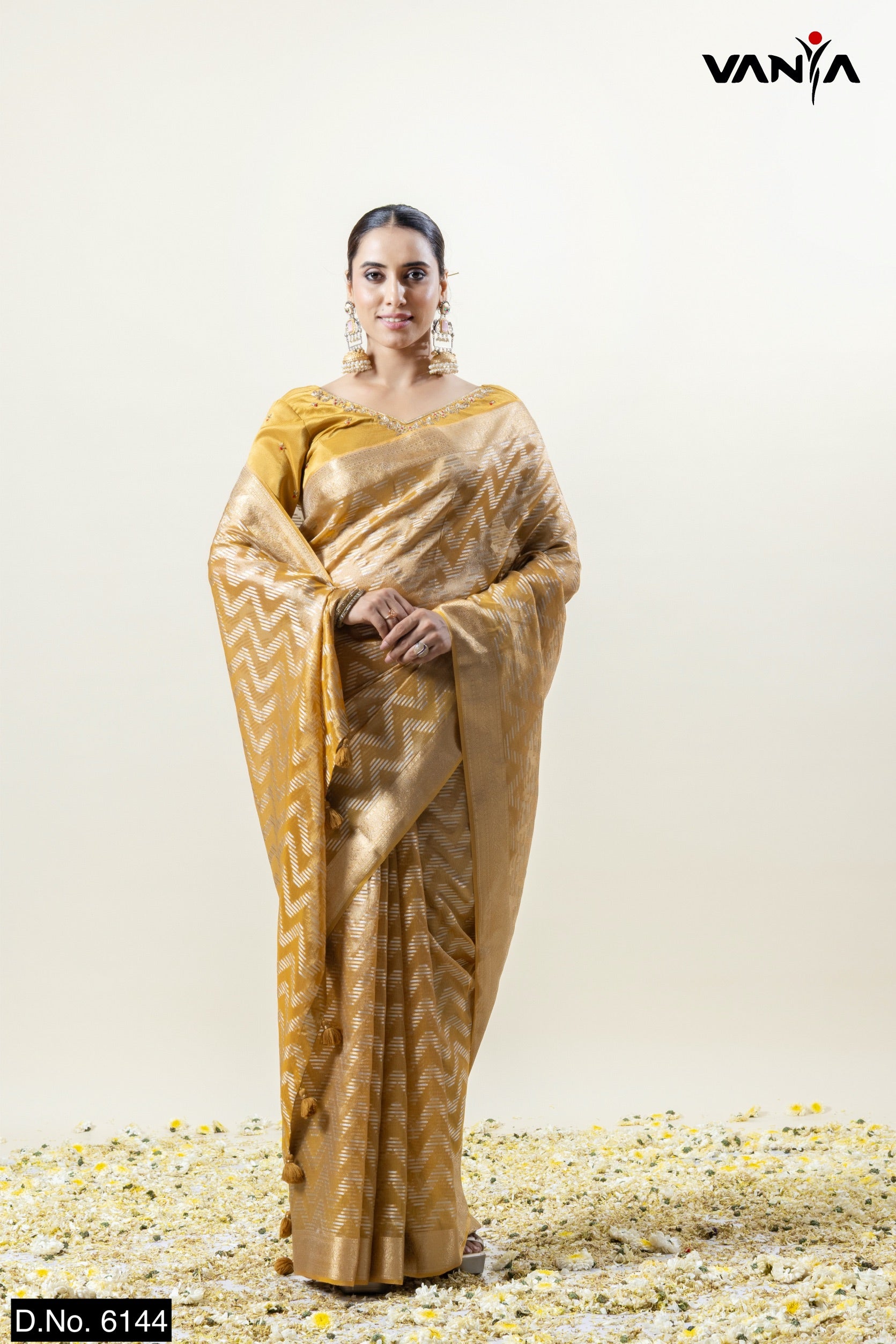 Command attention in this spectacular Vanya saree, where contemporary chevron weaves meet the timeless grandeur of Banarasi silk. Bathed in a radiant mustard gold and illuminated with silver zari, this saree is a celebration of modern design rooted in heritage craftsmanship. It's the perfect statement piece for the woman who honors tradition while embracing a bold, contemporary aesthetic.