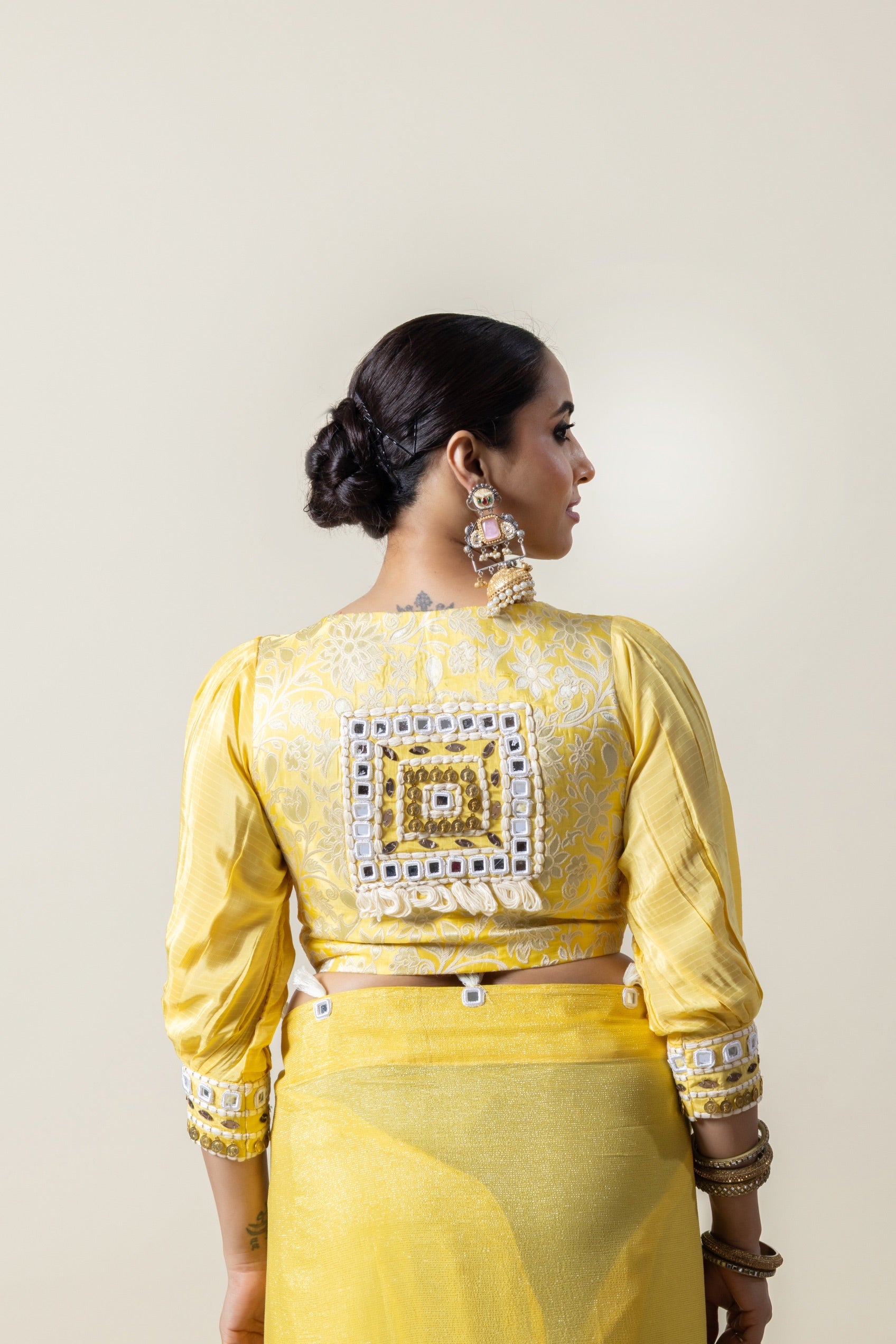 This ensemble is a statement in itself. Opt for a pair of heavy, traditional jhumkas and a stack of antique gold bangles. A sleek, polished bun is a must to showcase the stunning mirror work on the back of the blouse.