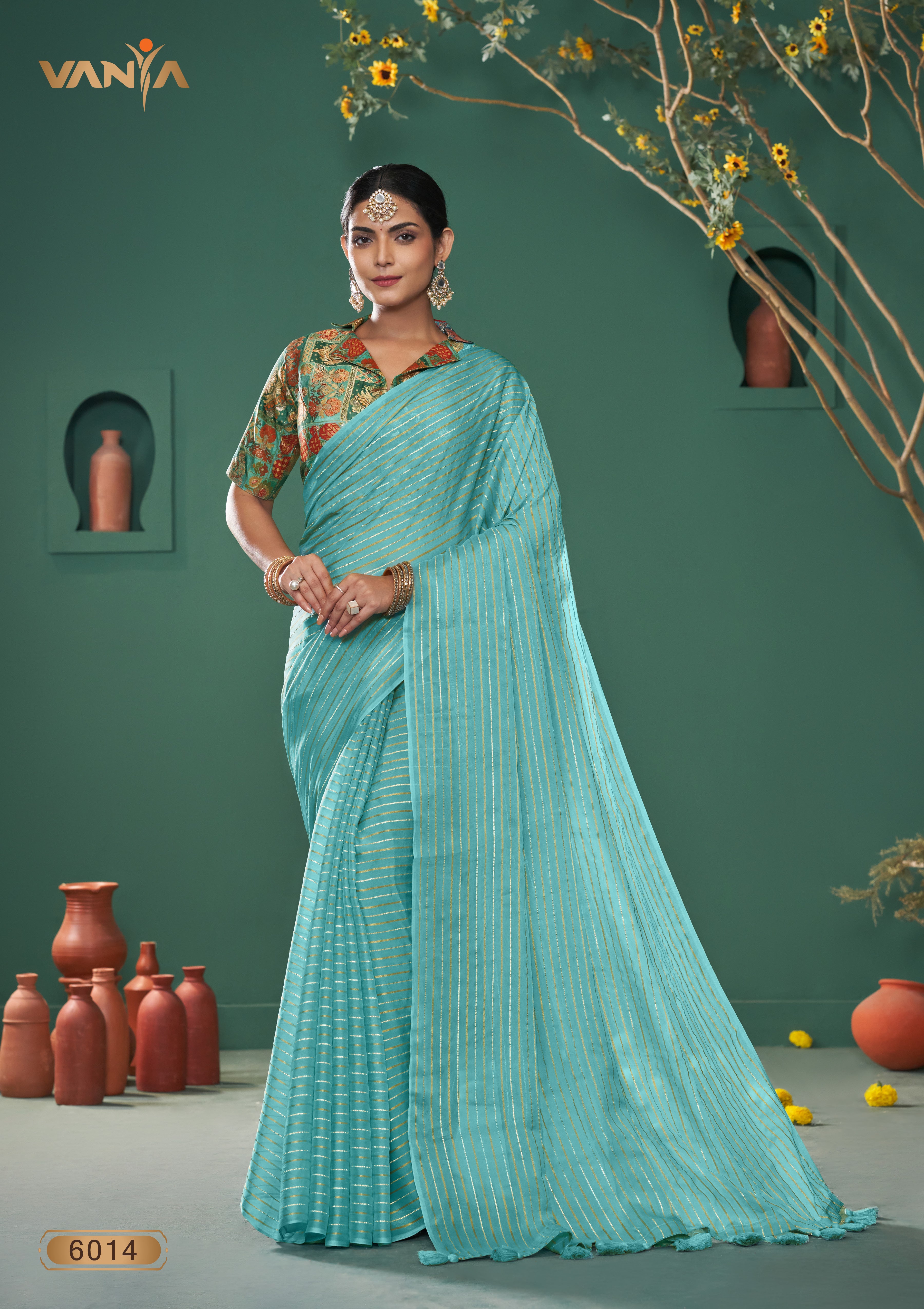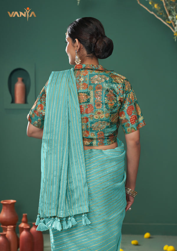 Redefine festive glamour with this exceptionally chic Vanya saree. The lustrous, crushed georgette in a refreshing shade of aqua blue shimmers with delicate zari stripes, creating a look of minimalist elegance. The true showstopper is the magnificent, multi-color designer blouse, featuring a rich tapestry-like print and a modern shirt collar for a bold, fashion-forward statement that is sure to turn heads.