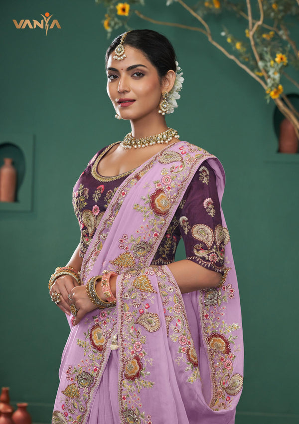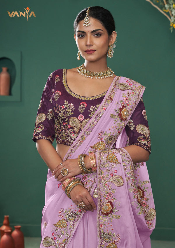 Step into a world of regal romance with this breathtaking Vanya saree, a masterpiece of opulent embroidery and sophisticated color. The lustrous Chinon silk flows in a dreamy shade of lilac, providing a perfect canvas for the magnificent, multi-color floral and paisley embroidery that lavishly adorns its border. Paired with a richly contrasted and heavily embroidered plum blouse, this ensemble is pure enchantment, designed for your most glamorous moments.