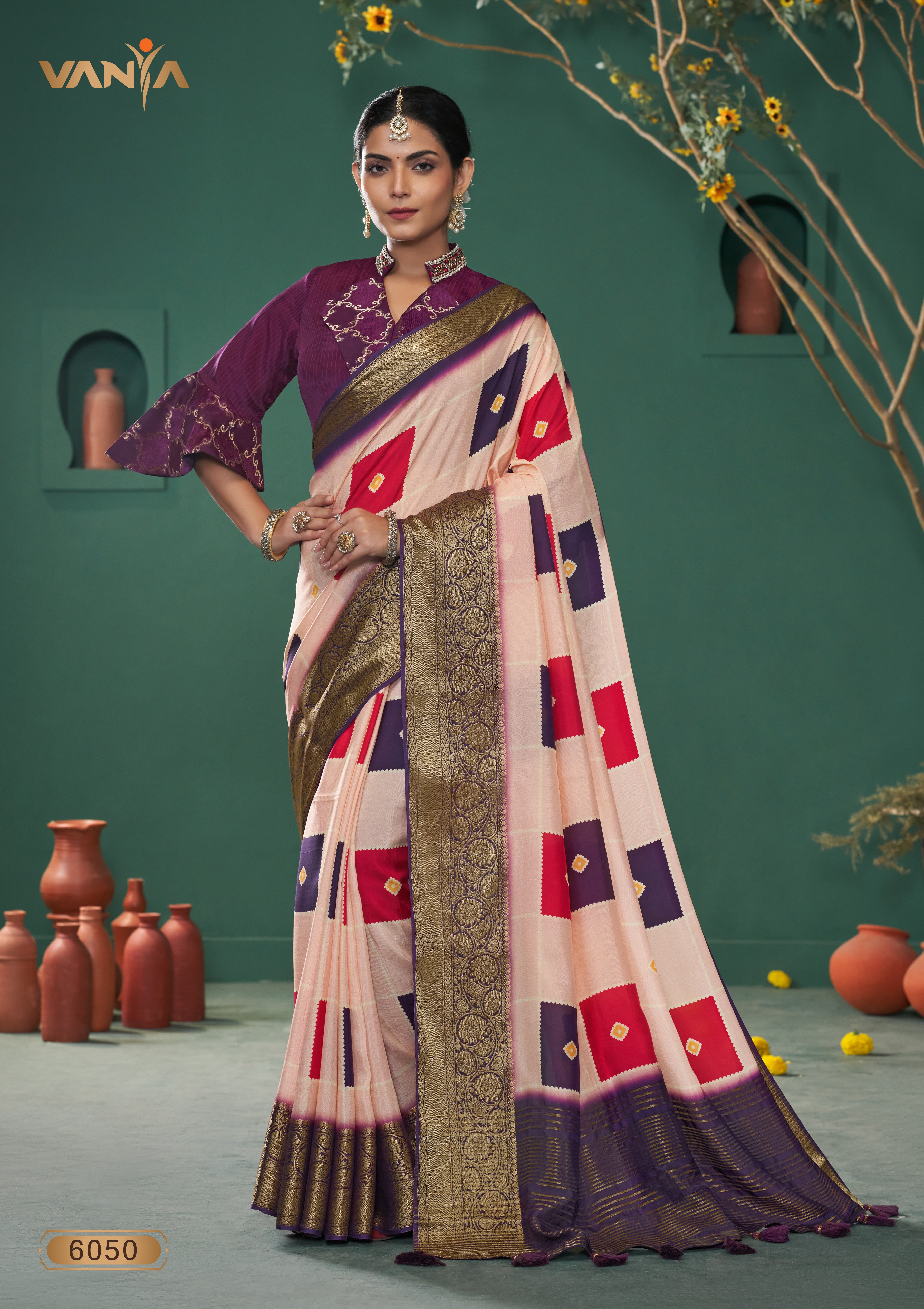 Make a bold, artistic statement with this extraordinary Vanya Katan silk saree. A masterpiece of modern weaving, it features a graphic, color-blocked pattern of peach, red, and purple inspired by traditional Patola craft. The true drama unfolds in the exquisitely tailored designer blouse, with its high collar and flared sleeves, creating a look that is unapologetically glamorous and steeped in high fashion.