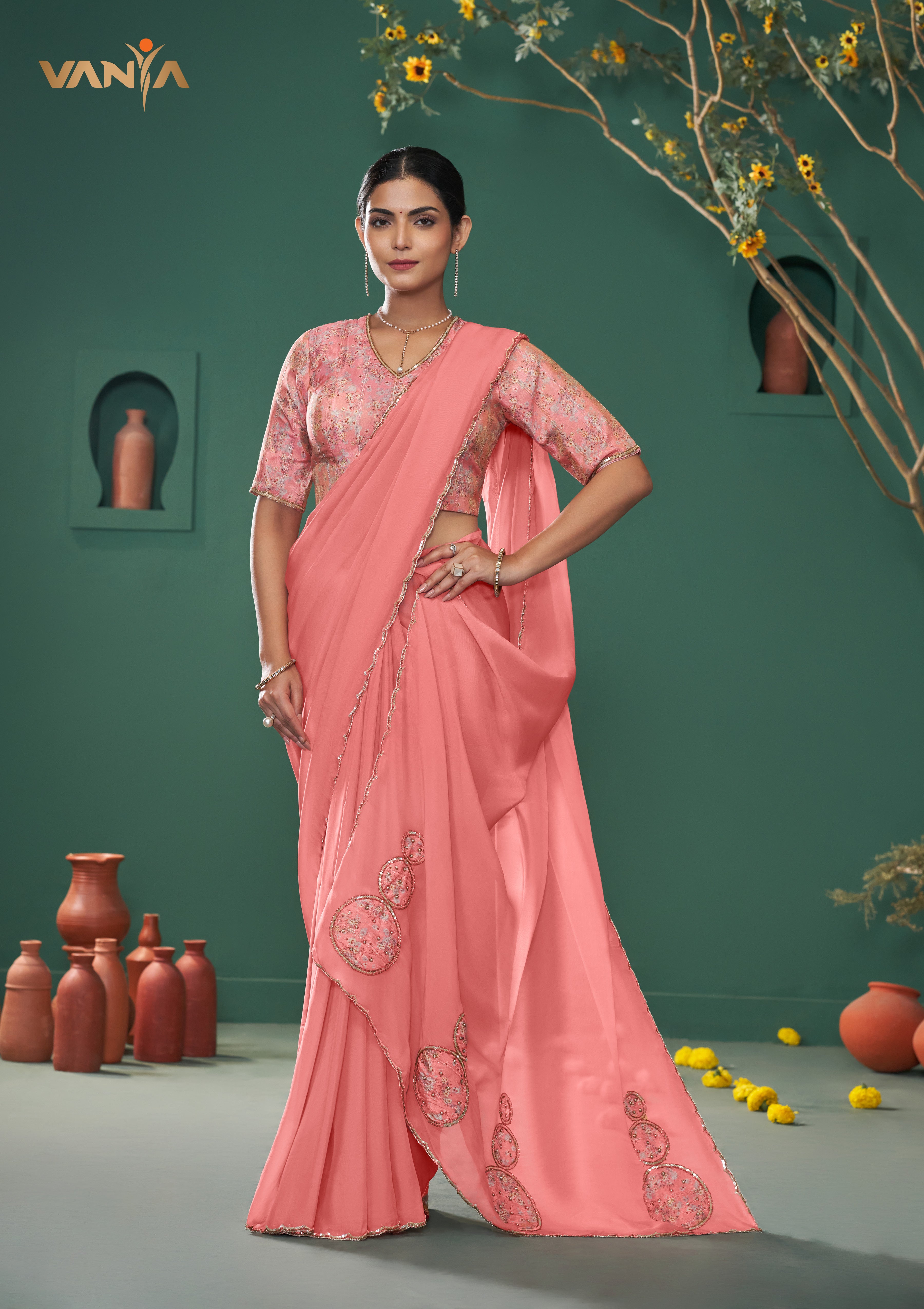 Step into a world of dreamy romance with this enchanting Vanya saree. The lustrous Chinon silk, in a soft and romantic shade of peach, drapes like a dream. The saree is brought to life by a unique and magnificent border of heavily embroidered circular motifs, creating a look that is both modern and timelessly graceful. Paired with a beautiful printed blouse, this ensemble is perfect for making an ethereal statement.