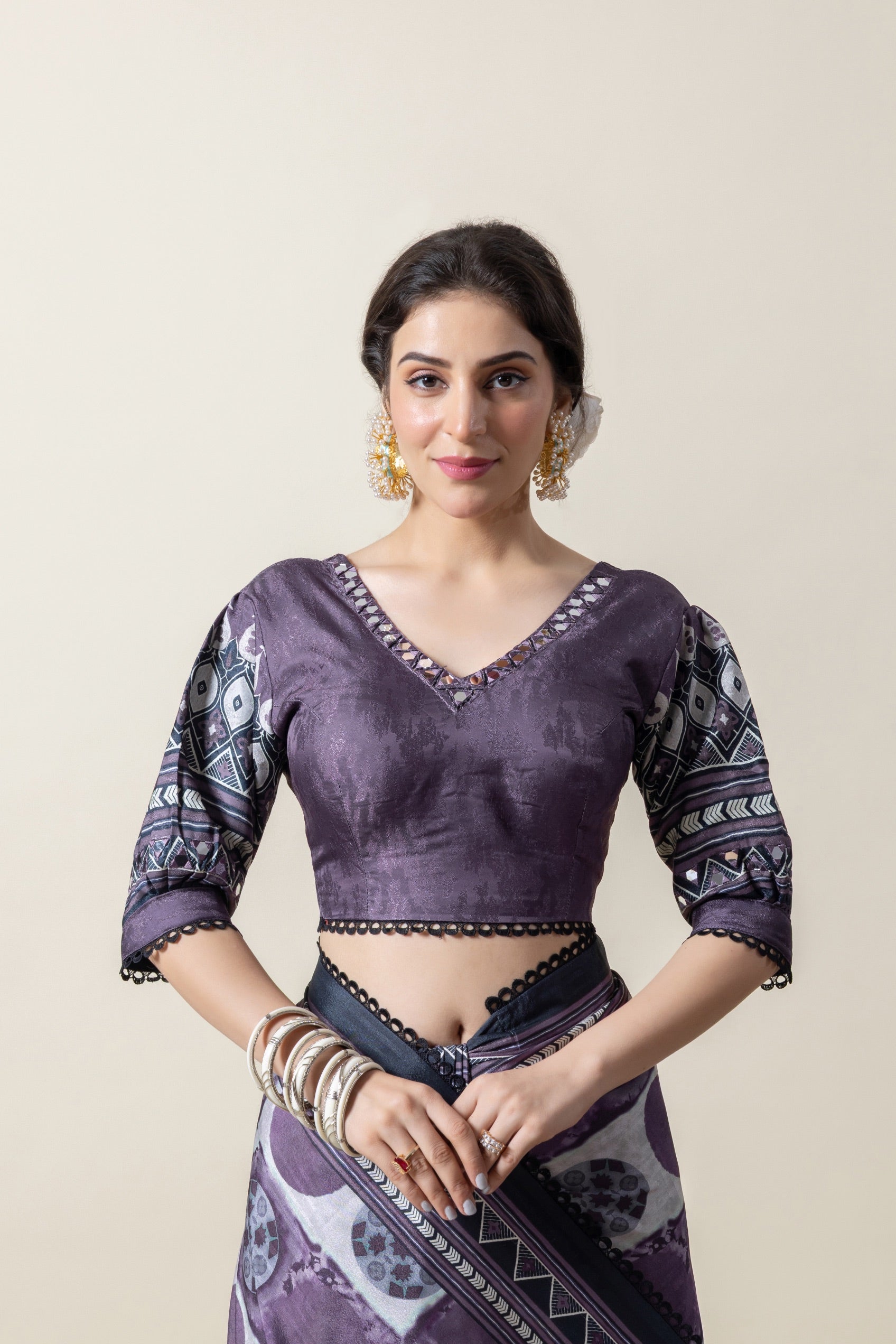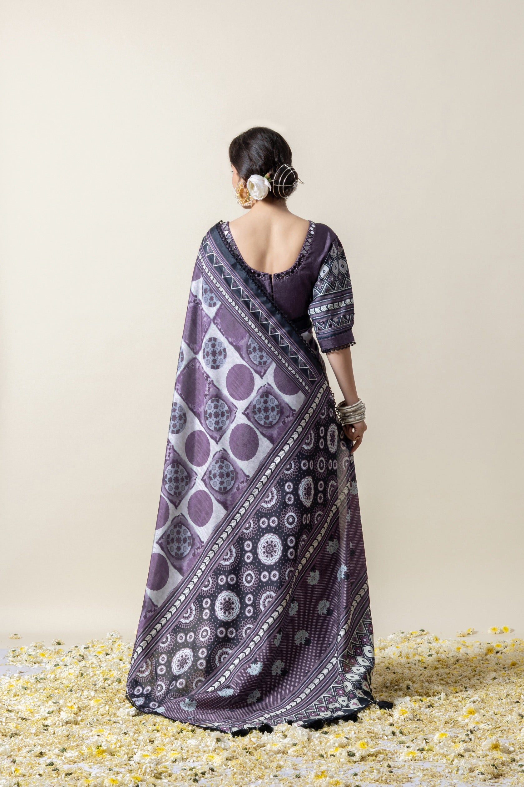 Purple and Grey Geometric Printed Crepe Silk Saree with Mirror Work Designer Blouse