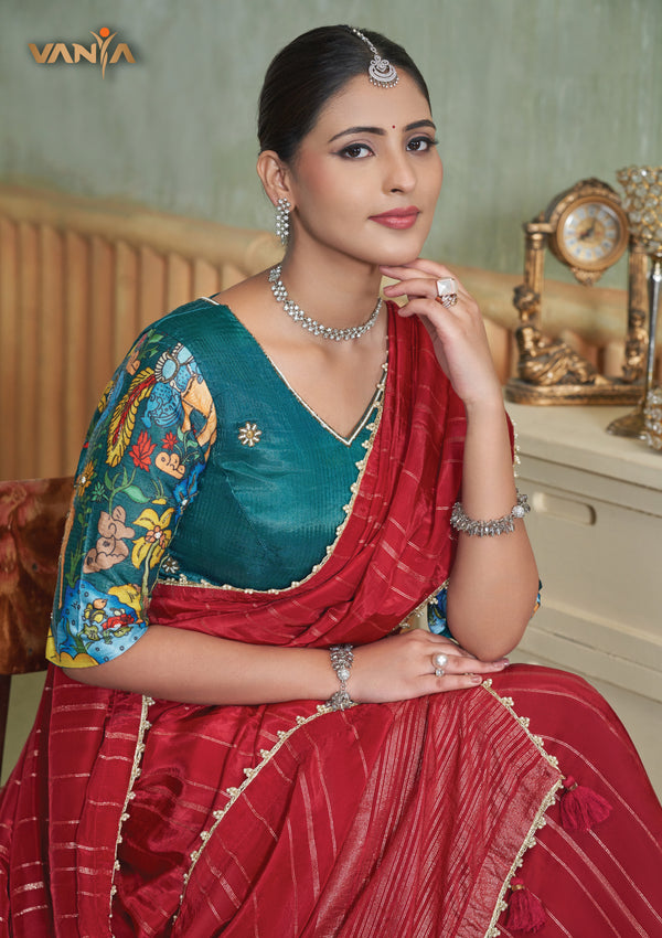 Red Crushed Georgette Saree with Zari Stripes and Teal Kalamkari Print Blouse