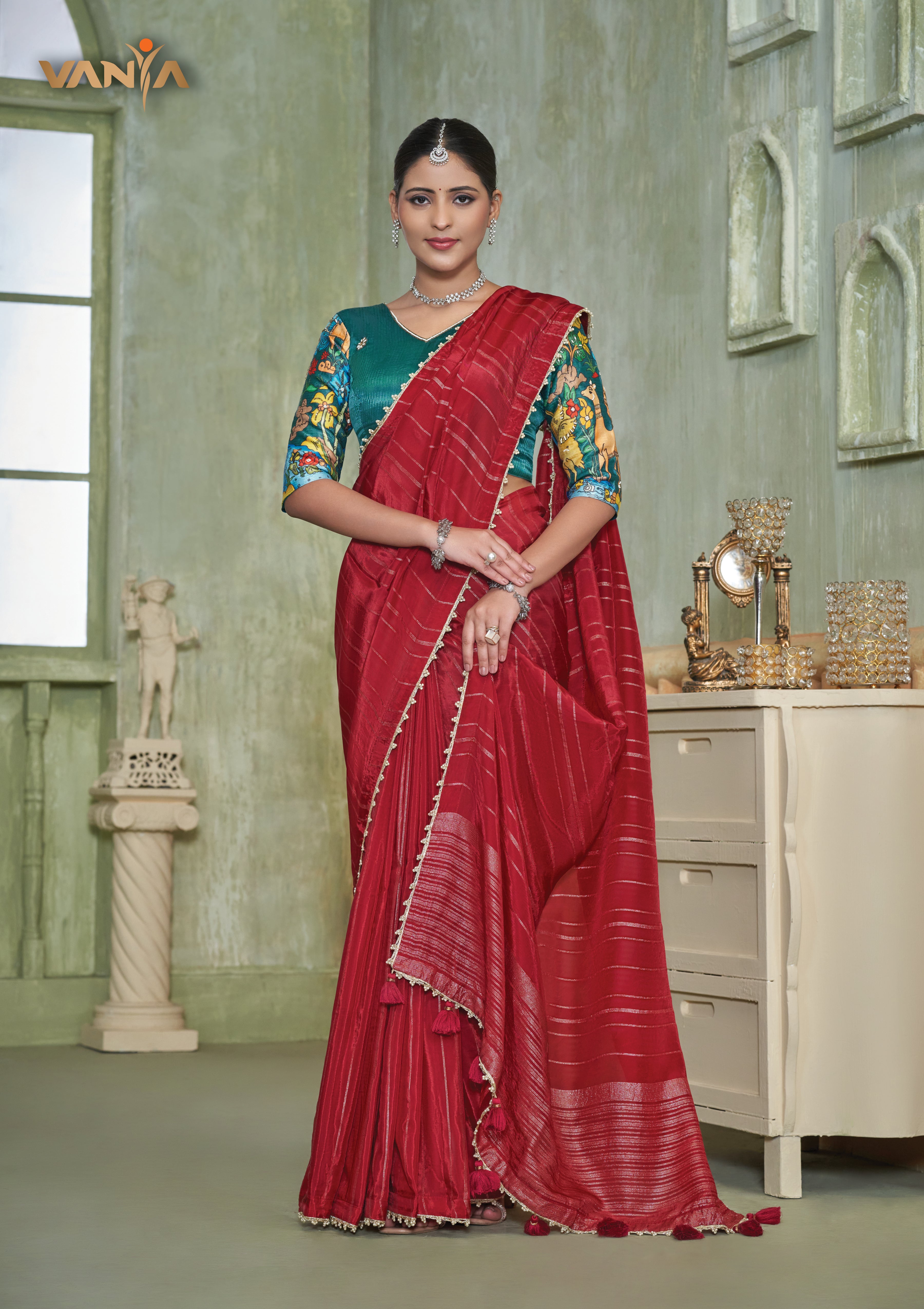 Radiate festive elegance in this stunning Vanya saree, a masterpiece of contemporary design and heritage art. The lustrous, crushed georgette in a classic shade of ruby red shimmers with delicate zari stripes, creating a look of minimalist grace. The true showstopper is the magnificent, multi-color designer blouse, featuring a rich, painterly print inspired by traditional Kalamkari art for a bold and artistic statement that is utterly captivating.