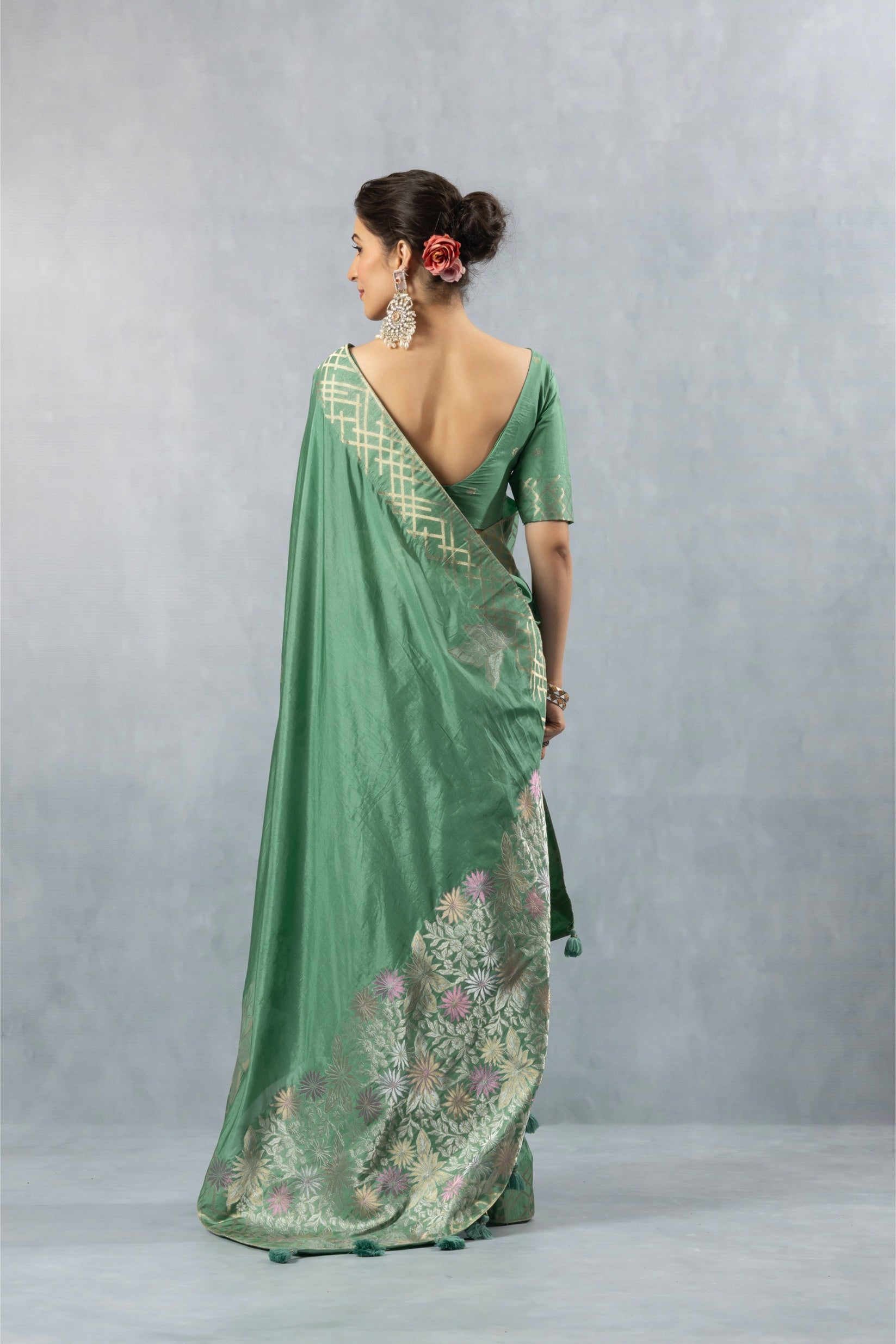 Embrace the understated charm of a blossoming garden with this serene sage green saree from Vanya. Crafted from a lustrous silk blend, this piece is a beautiful study in contrasts, where the soft, organic artistry of multi-colored floral weaving meets the crisp, modern lines of a geometric gold border. It's a sophisticated choice for the contemporary woman who appreciates design that is both timeless and of the moment.