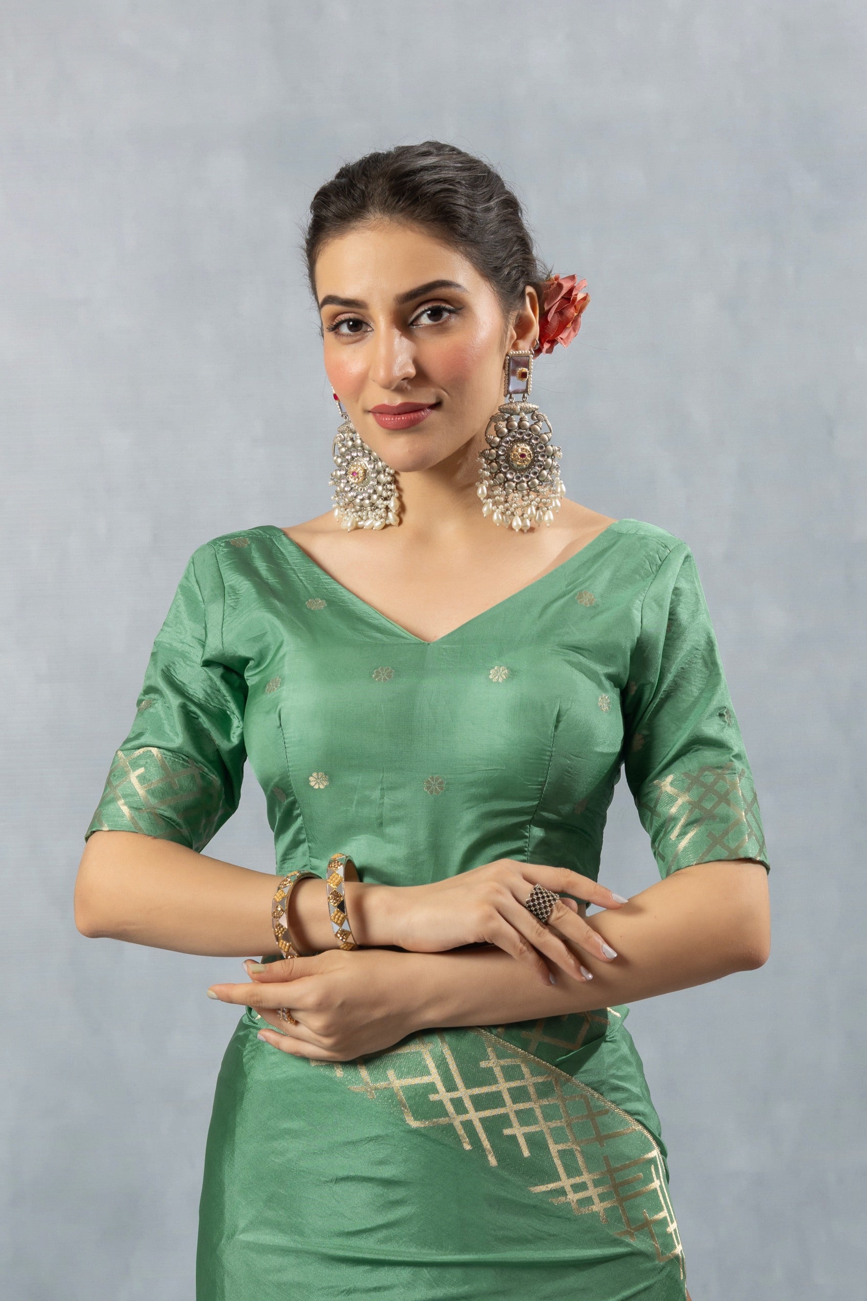 - Coordinated Designer Blouse: Comes with a beautifully tailored, ready-to-wear V-neck blouse in matching sage green, detailed with the same geometric border on the sleeves.