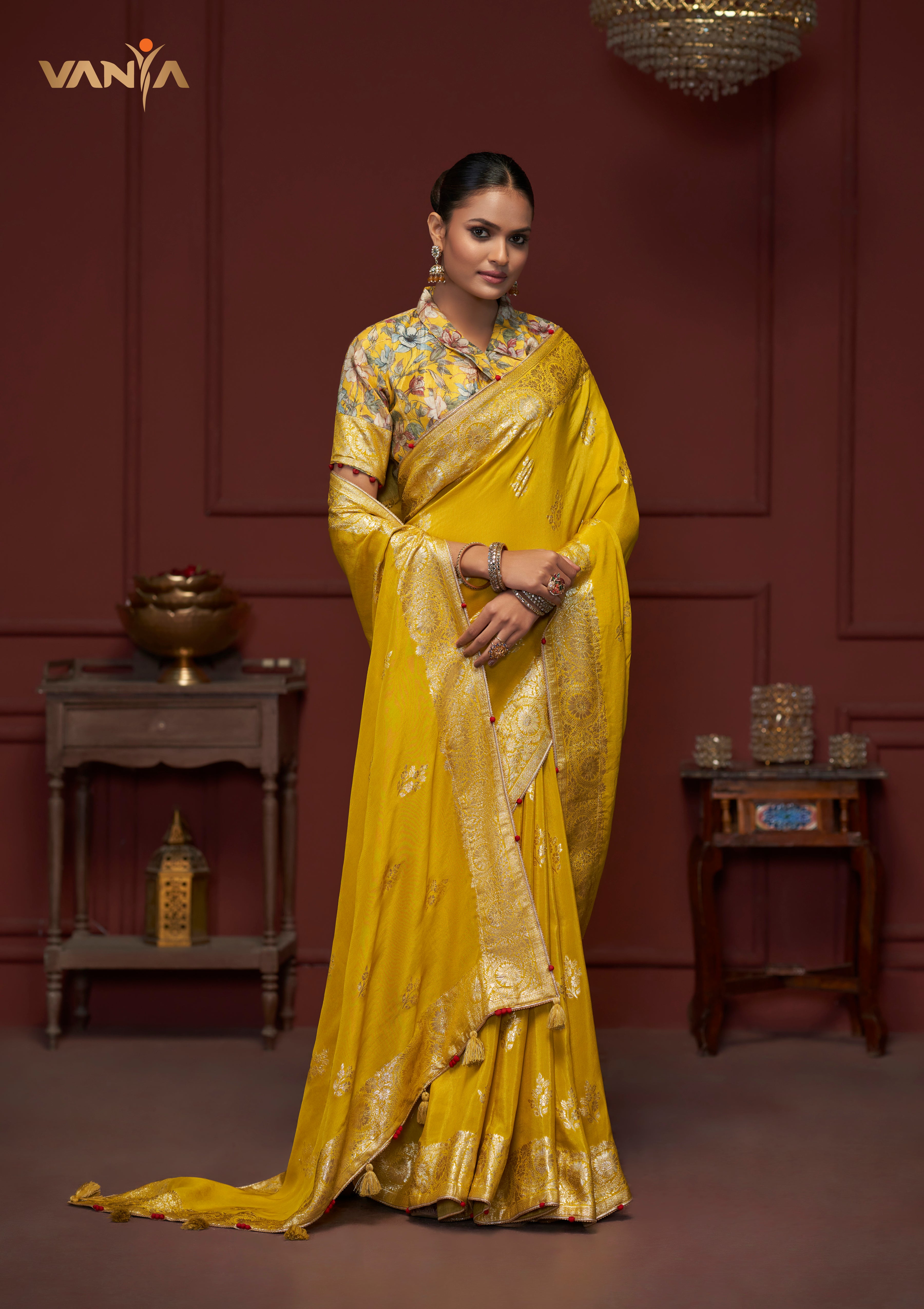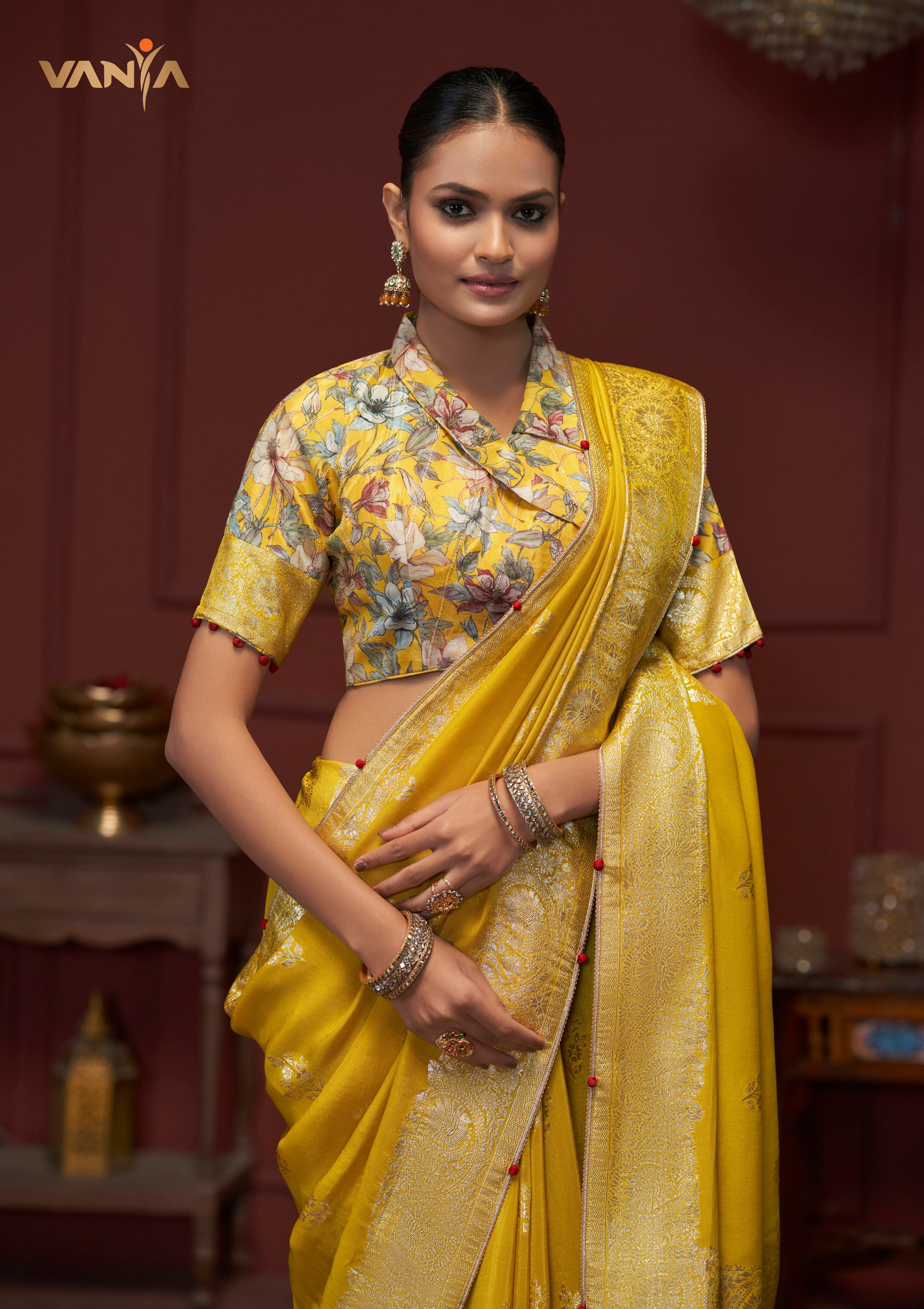 Radiate pure sunshine and high-fashion glamour in this stunning Vanya saree. The lustrous, crushed georgette in a vibrant Haldi yellow shimmers with elegance, framed by a magnificent, handwoven-look Banarasi border. The true showstopper is the exquisite, floral print designer blouse, featuring a chic and modern shirt collar for a bold, unforgettable look that perfectly blends tradition with contemporary style.